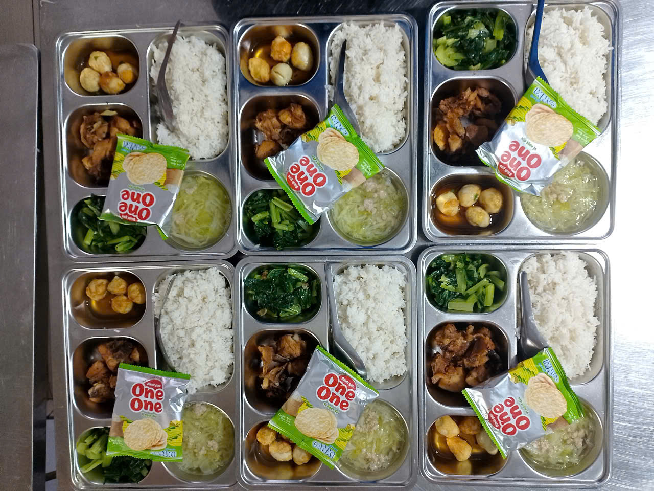 Cơm trắng, gà rang muối thơm ngon, trứng cút rim tiêu đậm đà, cải ngọt xào xanh mướt cùng canh bắp cải nấu thịt ngọt thanh. Bữa ăn được kết thúc nhẹ nhàng với bánh gạo – món tráng miệng quen thuộc, hấp dẫn với các em nhỏ.