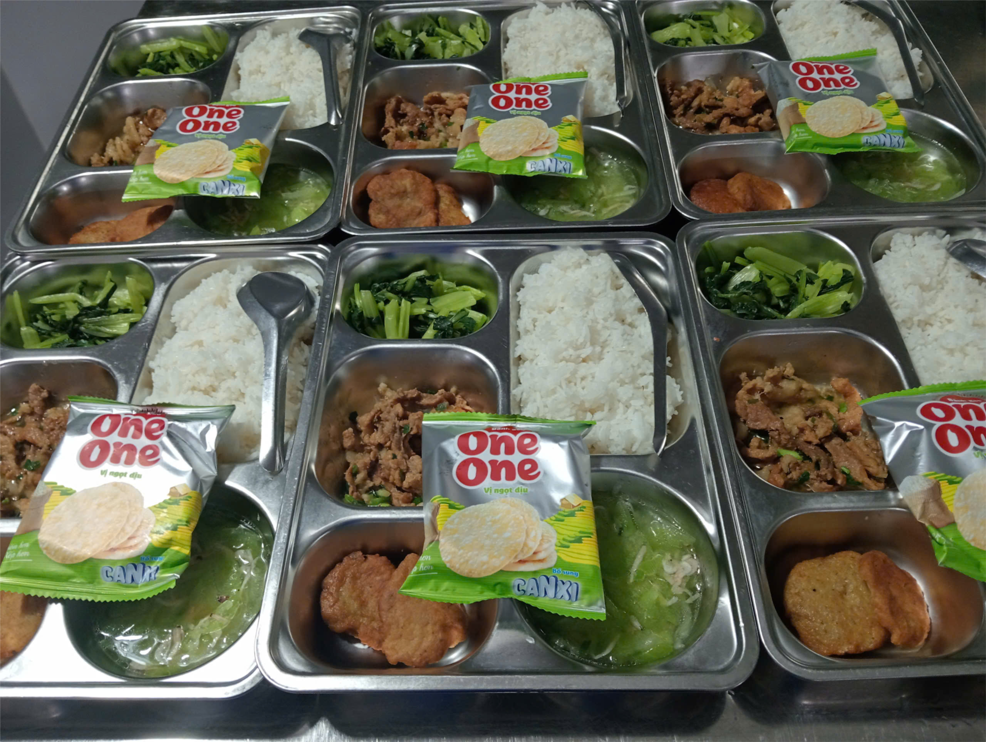 Trong bữa trưa ngày 03/3/2026, học sinh được thưởng thức các món ăn gồm: cơm trắng, thịt rang hành, trứng chiên, cải ngọt luộc, canh bí xanh nấu tép và bánh gạo. Đây là những món ăn quen thuộc, dễ ăn, giàu dinh dưỡng, cung cấp đầy đủ các nhóm chất như đạm, tinh bột, vitamin và khoáng chất.