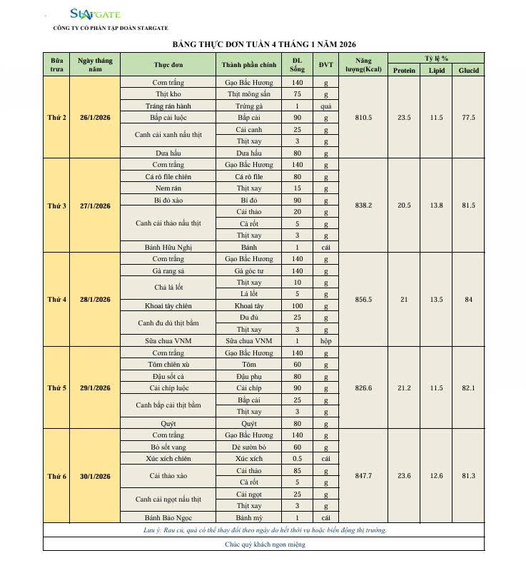 🔹 Năng lượng khẩu phần dao động từ 810 – 860 Kcal/bữa, đáp ứng nhu cầu dinh dưỡng theo khuyến nghị.