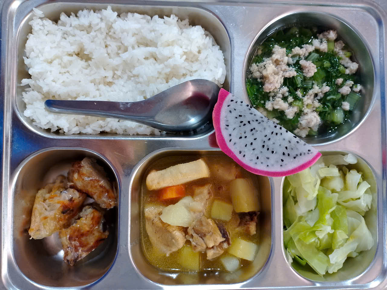 Bữa ăn được dùng cùng cơm trắng nóng hổi, đảm bảo cung cấp đủ năng lượng cho các hoạt động học tập buổi chiều. Kết thúc bữa trưa là món tráng miệng thanh long tươi, giúp giải nhiệt, bổ sung vitamin và tăng cường sức đề kháng cho các em học sinh.