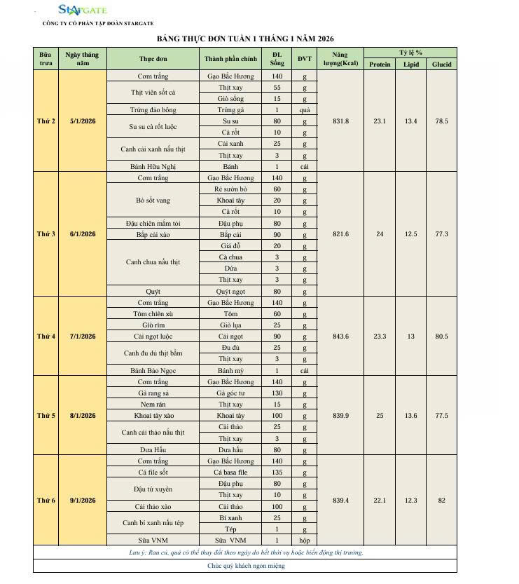 Thực đơn được xây dựng khoa học, phù hợp với lứa tuổi học sinh tiểu học, đảm bảo cân đối các nhóm chất: đạm – béo – tinh bột – vitamin và khoáng chất. Các món ăn được thay đổi hằng ngày, phong phú và đa dạng, kết hợp hài hòa giữa món mặn, món xào, canh và trái cây tráng miệng, giúp các em ăn ngon miệng, đủ năng lượng cho học tập và sinh hoạt.
