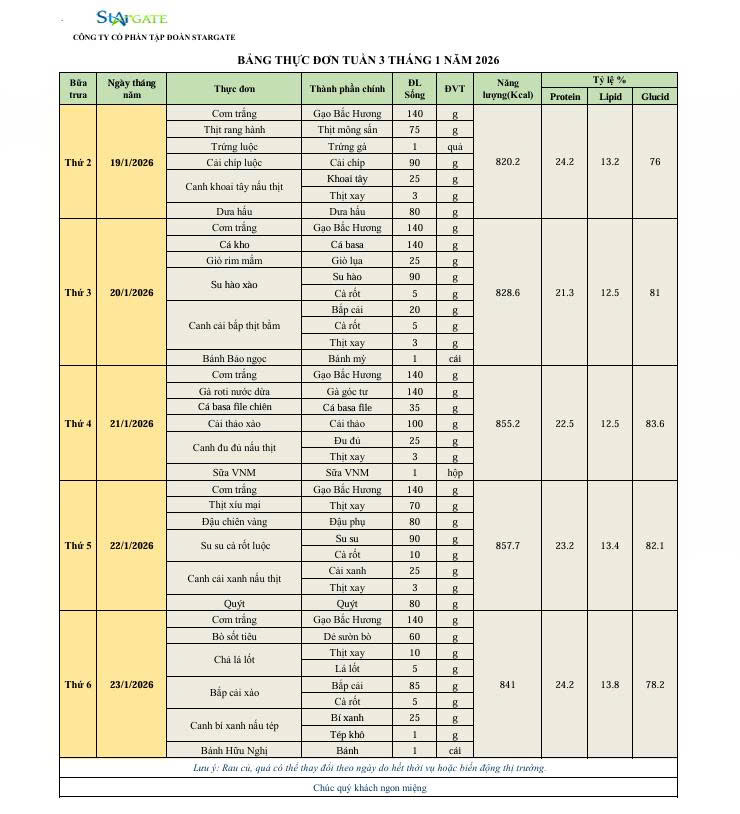 Nguồn thực phẩm được lựa chọn đảm bảo tươi ngon, rõ nguồn gốc, quá trình chế biến tuân thủ nghiêm ngặt các quy định về an toàn thực phẩm. Khẩu phần ăn được tính toán hợp lý, đáp ứng nhu cầu năng lượng cần thiết cho hoạt động học tập và vui chơi của học sinh trong ngày.