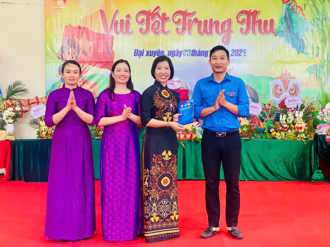 Tiếp nối không khí ấm áp, sân trường trở nên rực rỡ với hoạt động cắm trại, trang trí bằng đèn ông sao, bóng bay và những câu đối chào mừng Trung thu. Cuộc thi bày mâm ngũ quả thu hút sự tham gia nhiệt tình của các em, với những mâm cỗ được bày biện sáng tạo, kết hợp các loại trái cây như bưởi, chuối, xoài, thể hiện ước vọng về một vụ mùa trù phú và cuộc sống sung túc. Bên cạnh đó, phần thi văn nghệ bùng nổ với các tiết mục hát, múa do chính các em học sinh biểu diễn, mang đến tiếng cười và niềm tự hào cho thầy cô, phụ huynh.